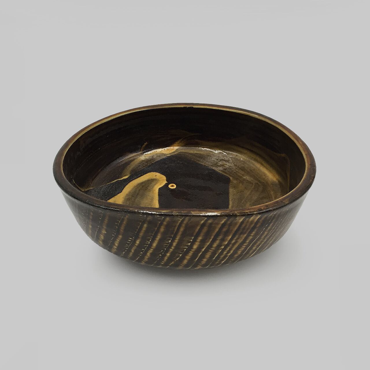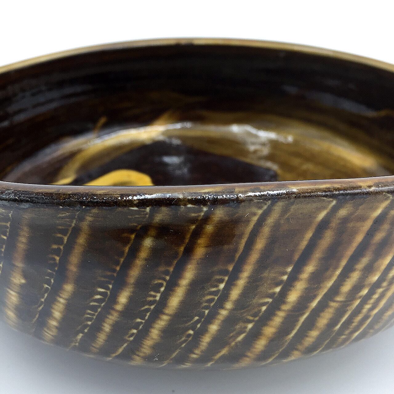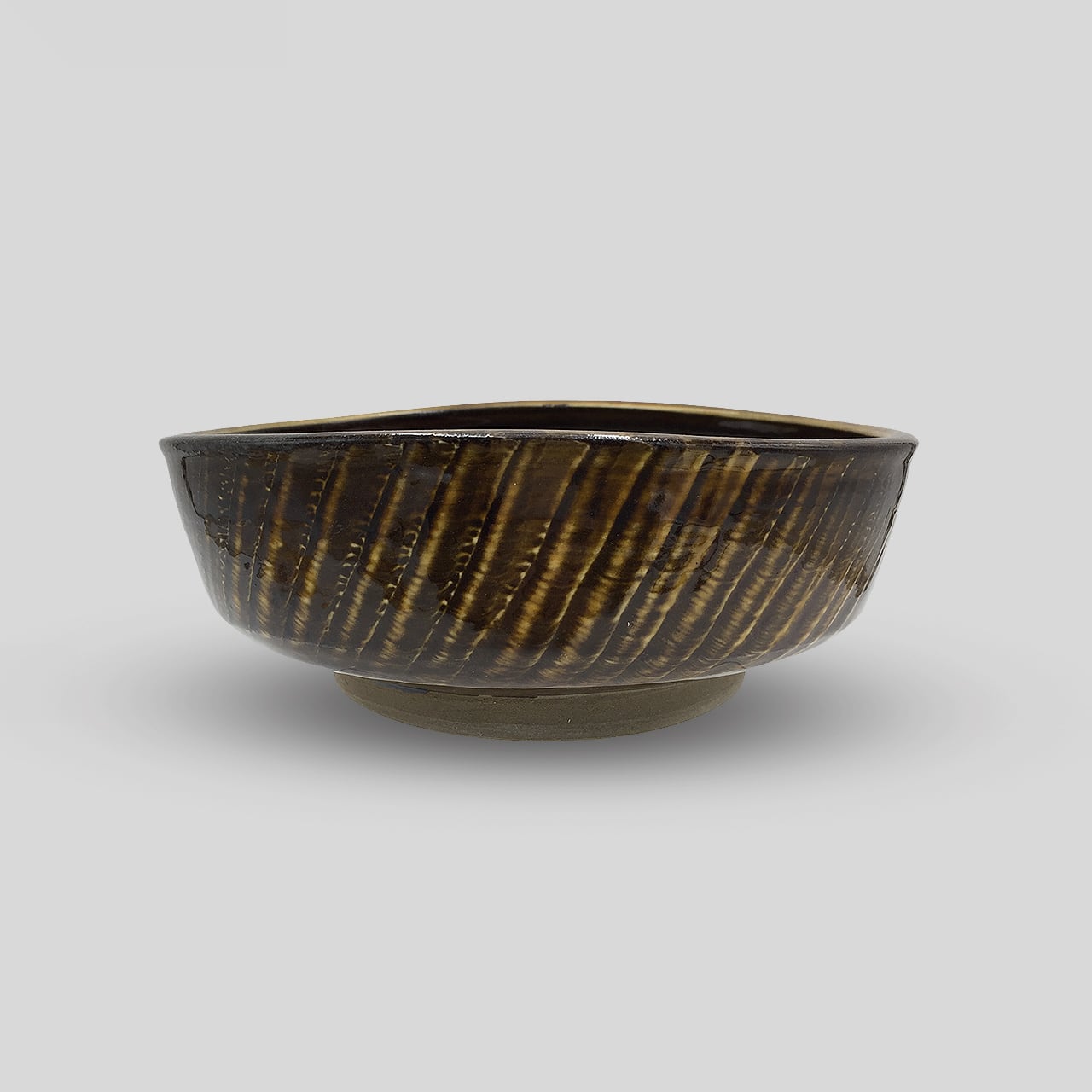 器の外側に小鹿田焼の伝統技法である「打ち刷毛目(はけめ)」を施しています。刷毛を使って化粧土で連続的な模様をつける技法です。ここでは、器の変形型に加え、刷毛目を斜めに入れるなど独特の雰囲気があり、インテリアのオブジェとしても存在感があります。器の内側には化粧土で波や飛沫の模様が美しく描かれています。