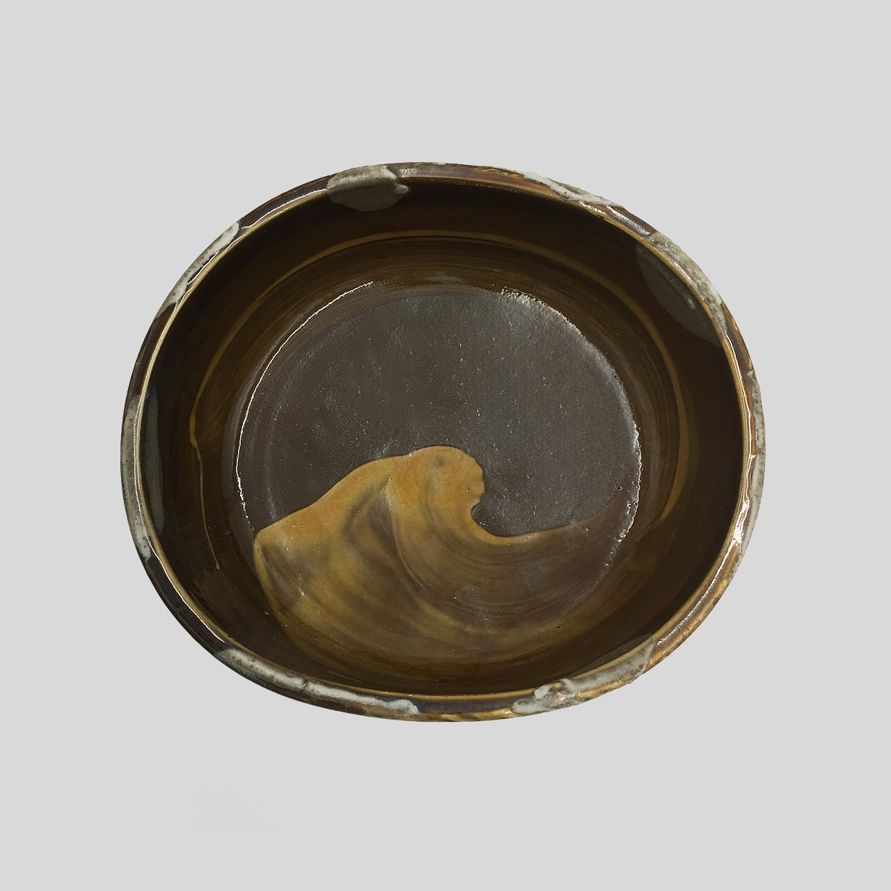 器の外側に小鹿田焼の伝統技法である「打ち刷毛目(はけめ)」を施しています。刷毛を使って化粧土で連続的な模様をつける技法です。ここでは、器の変形型に加え、刷毛目の方向に変化を付けるなど独特の雰囲気があり、インテリアのオブジェとしても存在感があります。さらに、器の内外に化粧土で模様が美しく描かれています。
