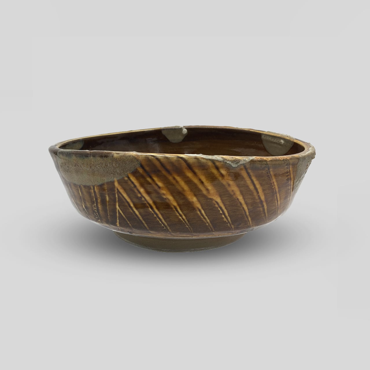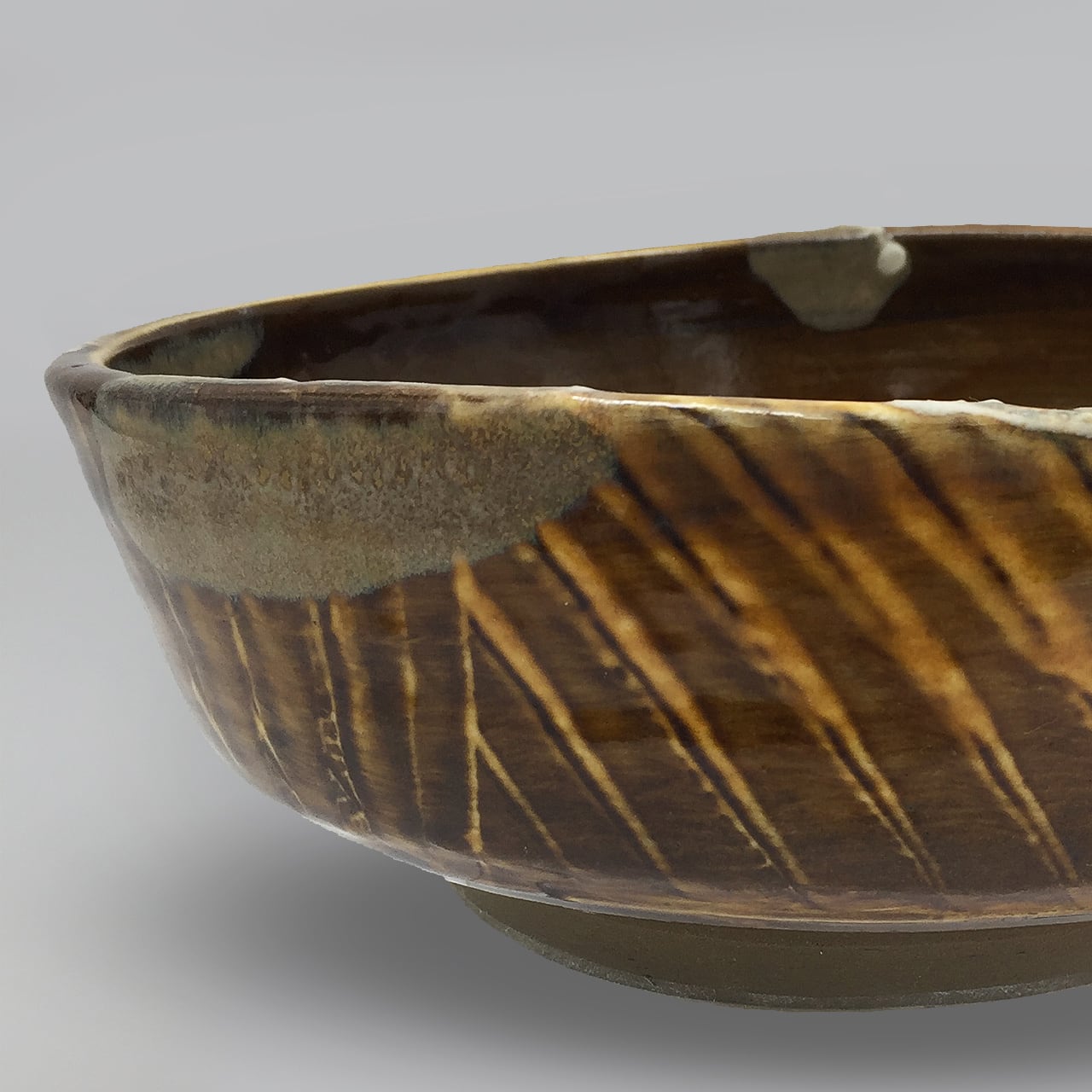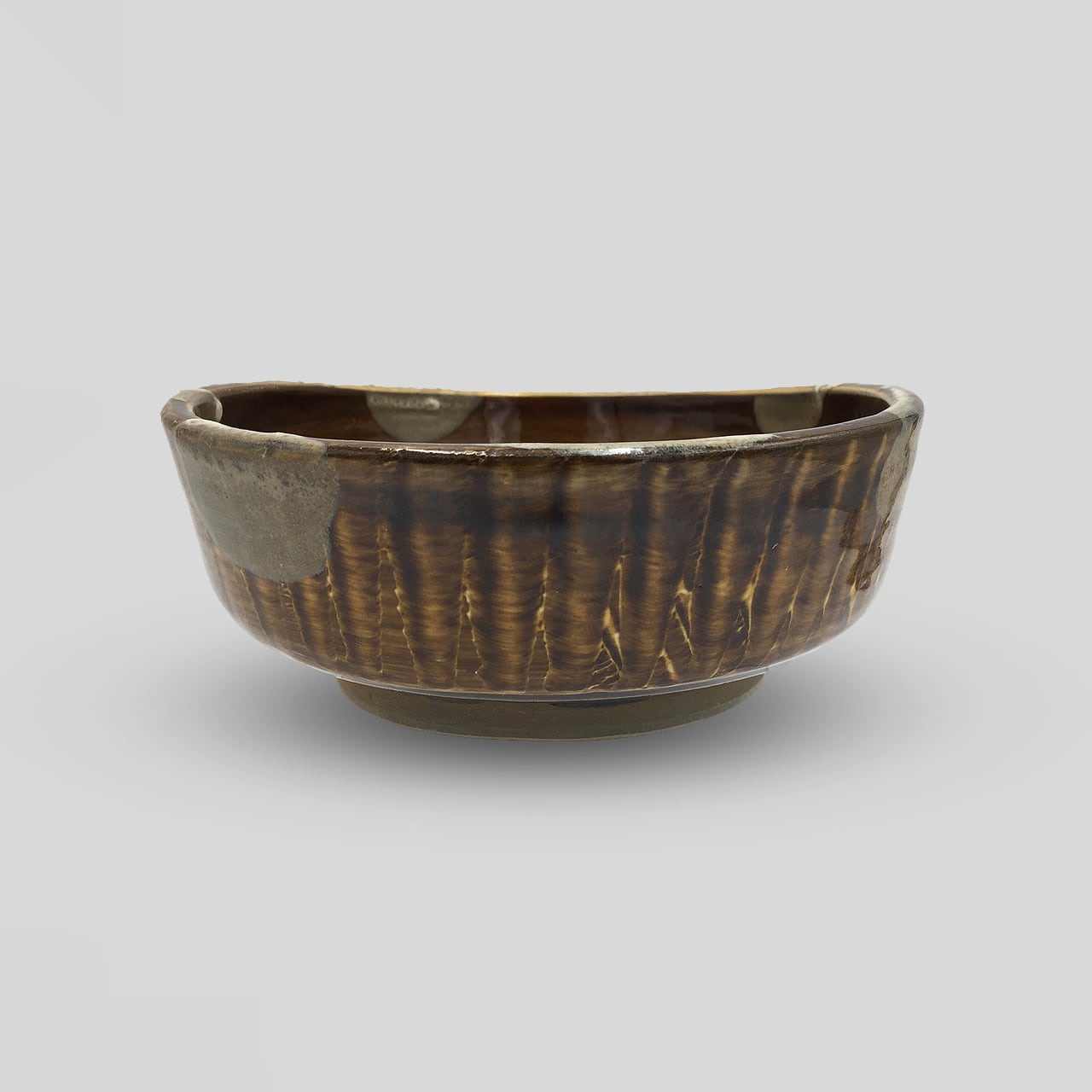 【一点もの】小鹿田焼 小袋窯 7寸中鉢 変形型 打ち刷毛目 茶 幅約21cm 花器 陶器 和食器 民藝