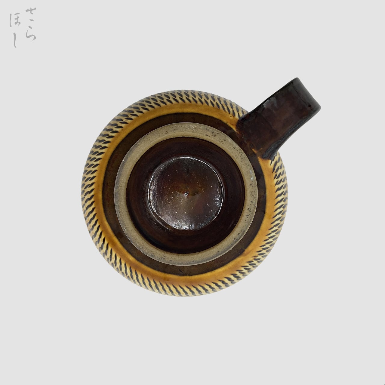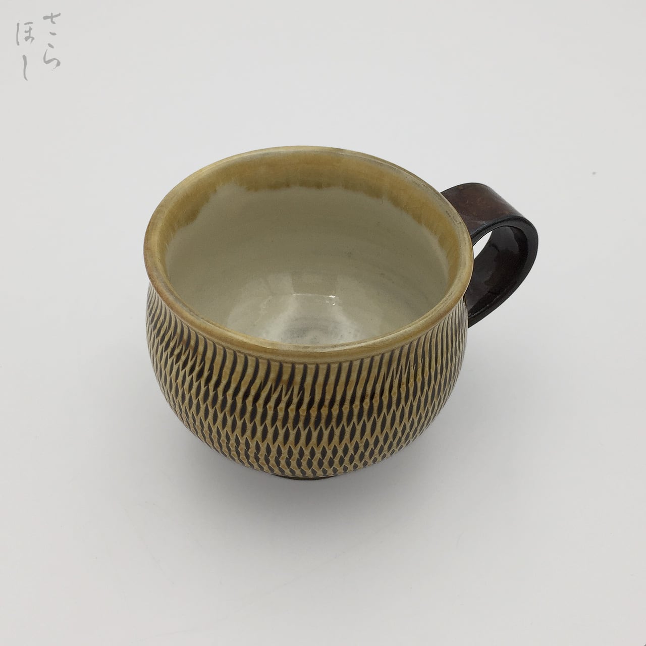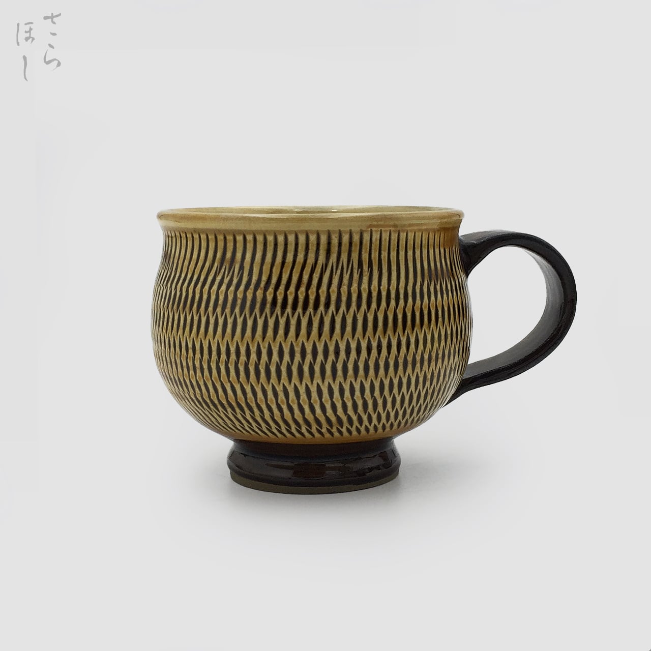 器の外側に小鹿田焼の伝統技法である「飛び鉋(かんな)」を施しています。弾力性のある金属で作った鉋を使用し、細かい連続的な削り目をつけ模様をつける技法です。