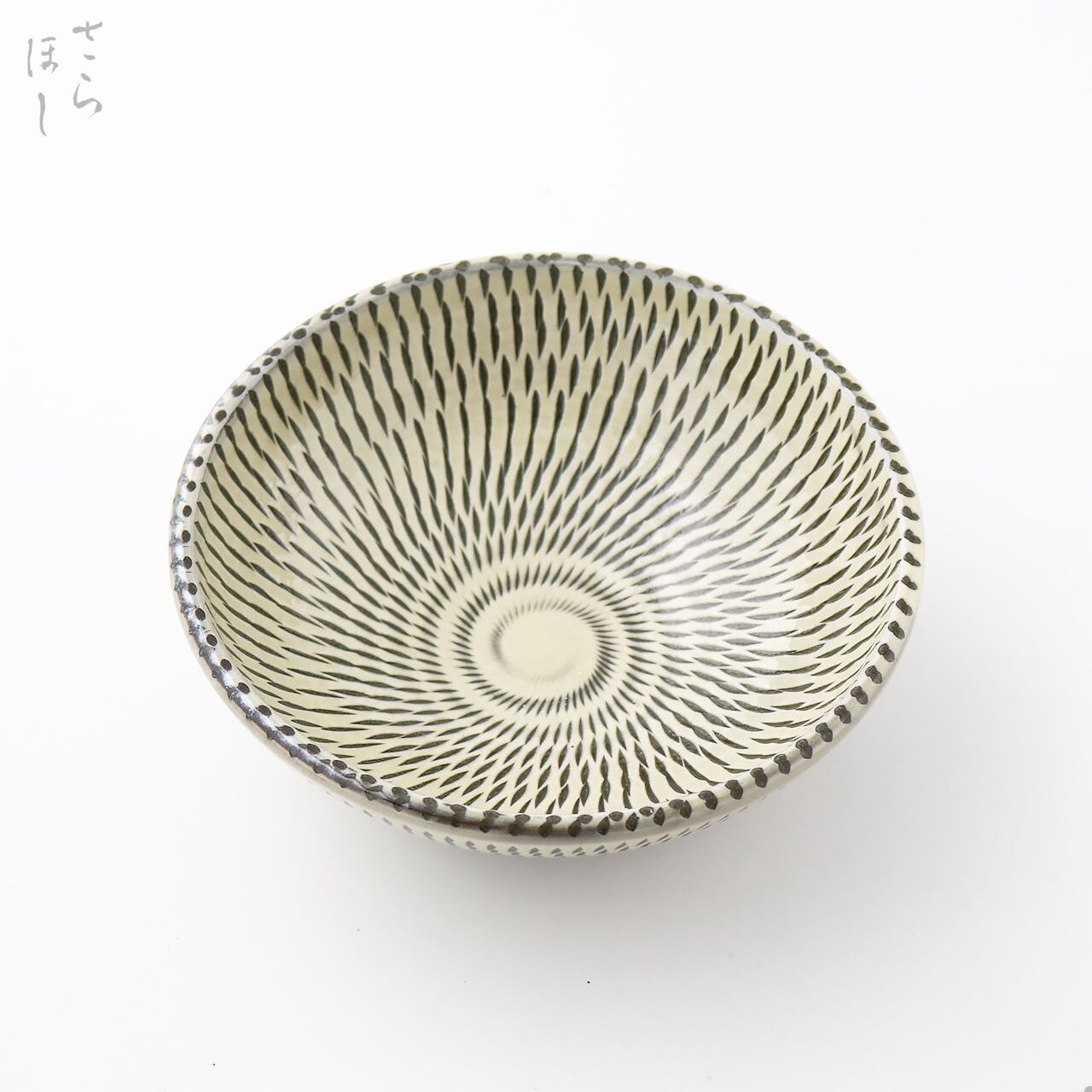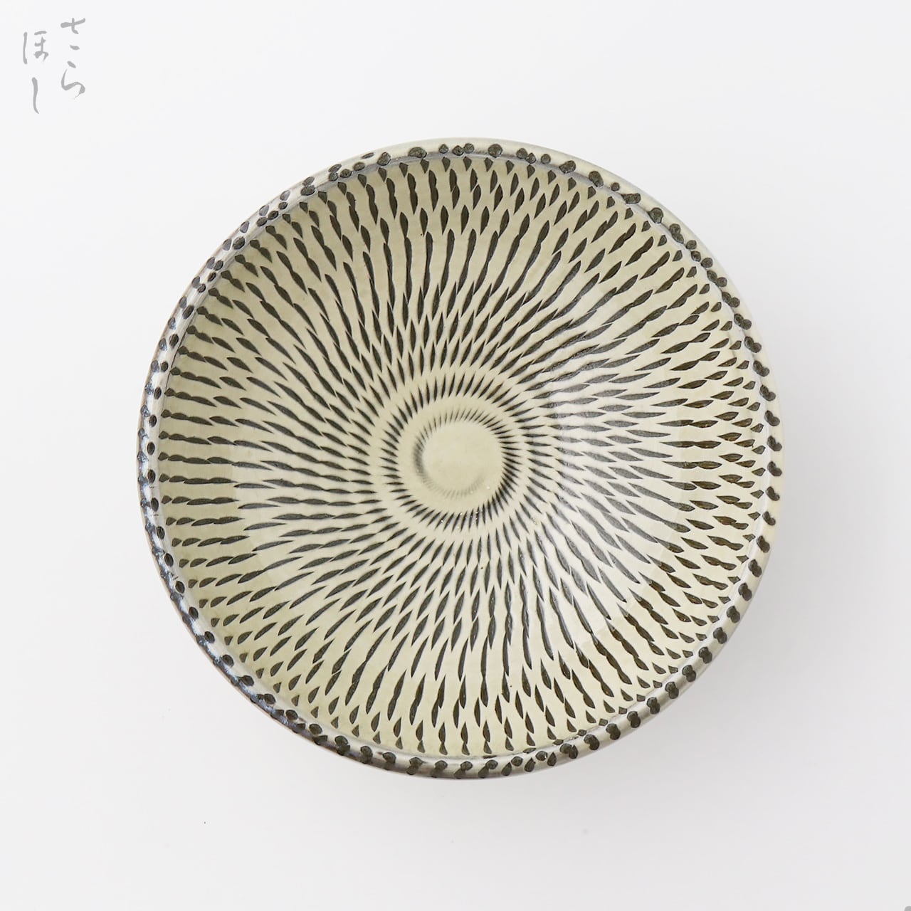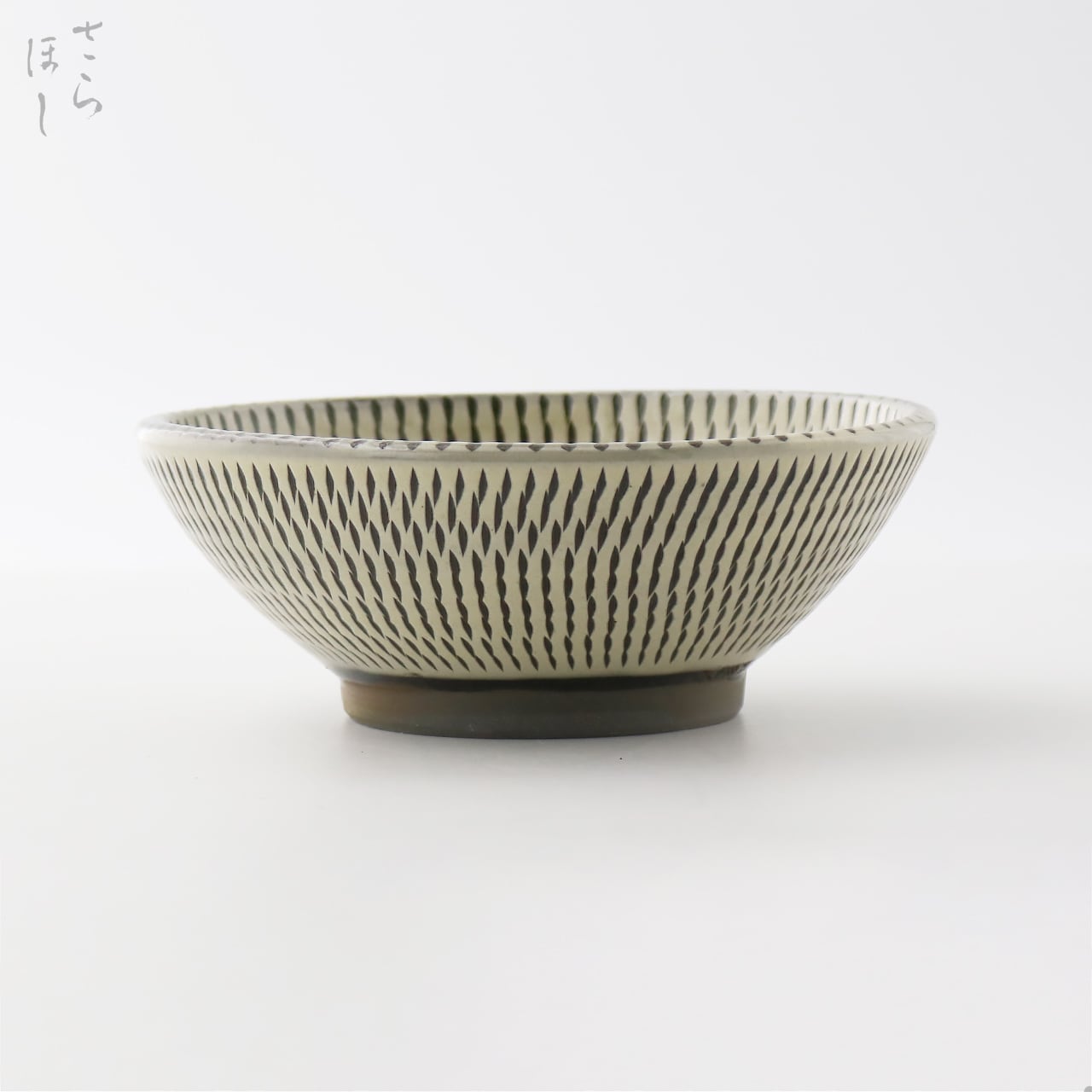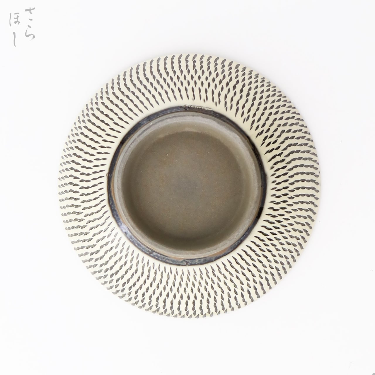 器の内外に小鹿田焼の伝統技法である「飛び鉋(かんな)」を施しています。弾力性のある金属で作った鉋を使用し、細かい連続的な削り目をつけ模様をつける技法です。