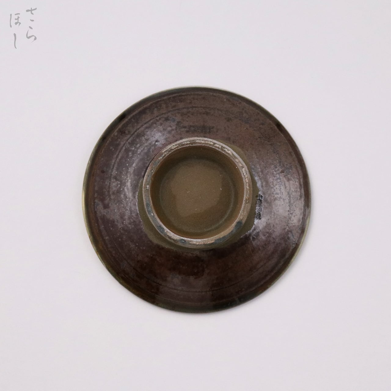 ・お皿等、窯で重ねて焼くものには、中央付近に白い円(目剥ぎ)があるものと無いものがあります。ご注文の際は目剥ぎの有無をご指定いただけません。ご了承ください。重なった部分がくっついてしまわないよう、釉薬を剥がした跡が白い円となって現れたものす。一番上で焼かれたものや、重ねずに焼かれたものには目剥ぎがありません。