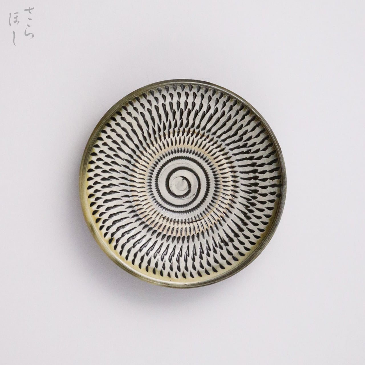 器の内側に小鹿田焼の伝統技法である「飛び鉋(かんな)」を施しています。弾力性のある金属で作った鉋を使用し、細かい連続的な削り目をつけ模様をつける技法です。