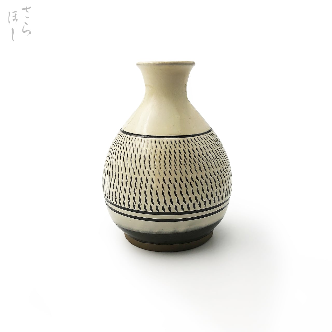 高さが約13.3cmあります。装飾として器に白化粧土を掛け、外側に櫛で線を上下に引き、間に小鹿田焼の伝統技法である「飛び鉋(かんな)」を施しています。上下に余白のある洗練されたデザインになっています。飛び鉋は、弾力性のある金属で作った鉋を使用し、細かい連続的な削り目をつけ模様をつける技法です。