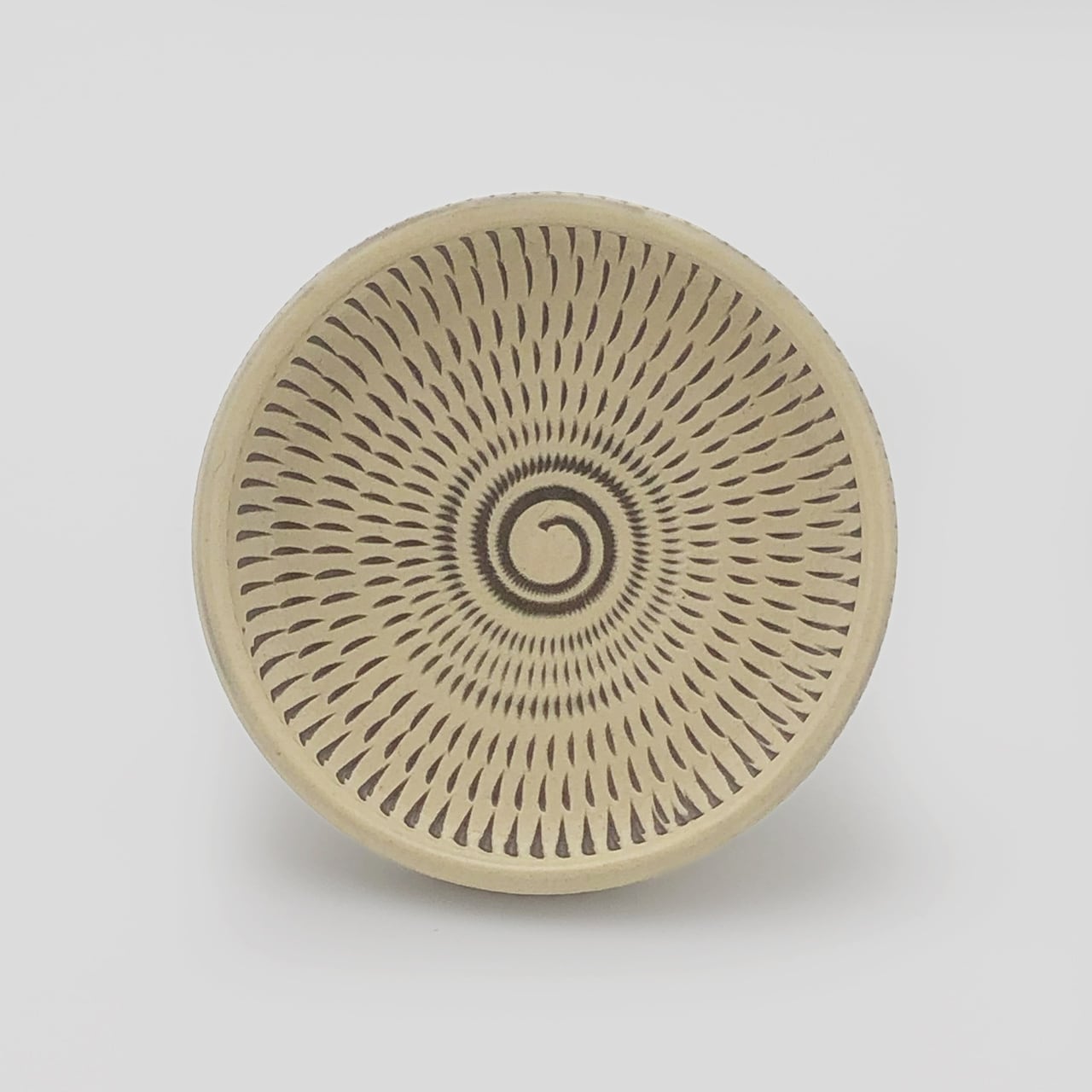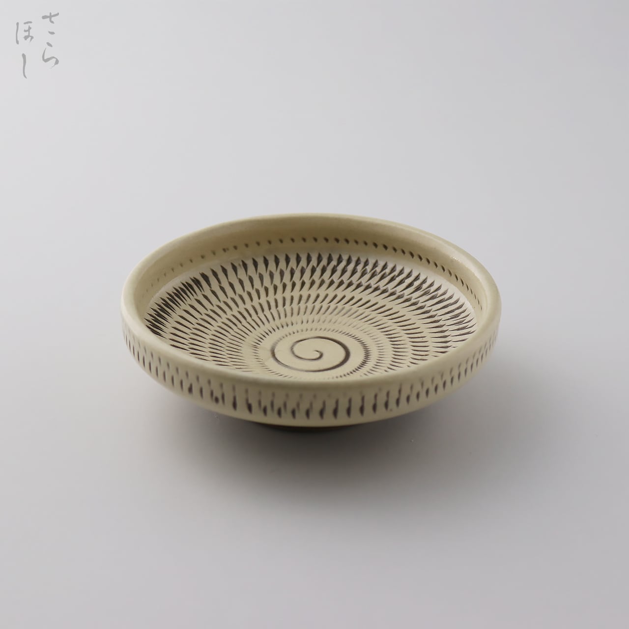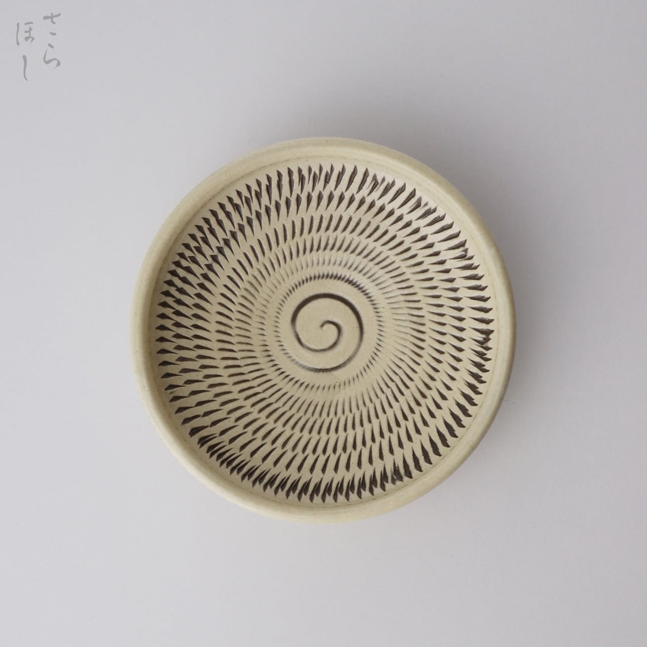 器の内外に小鹿田焼の伝統技法である「飛び鉋(かんな)」を施しています。弾力性のある金属で作った鉋を使用し、細かい連続的な削り目をつけ模様をつける技法です。