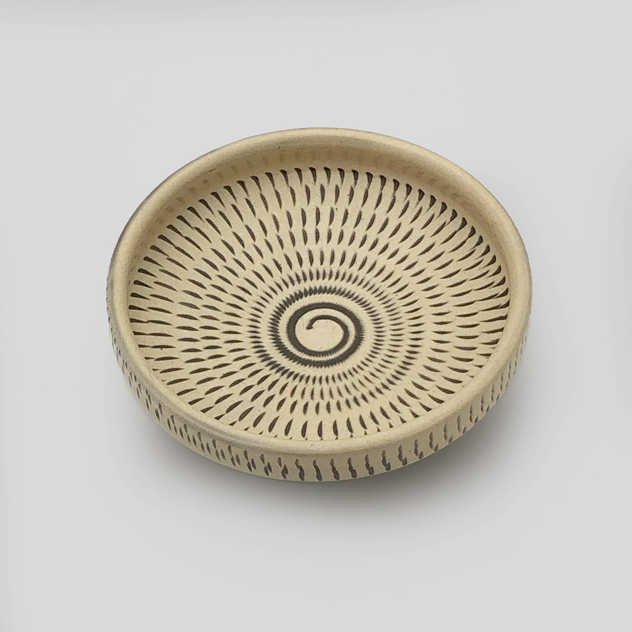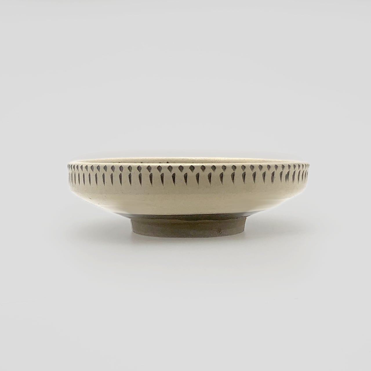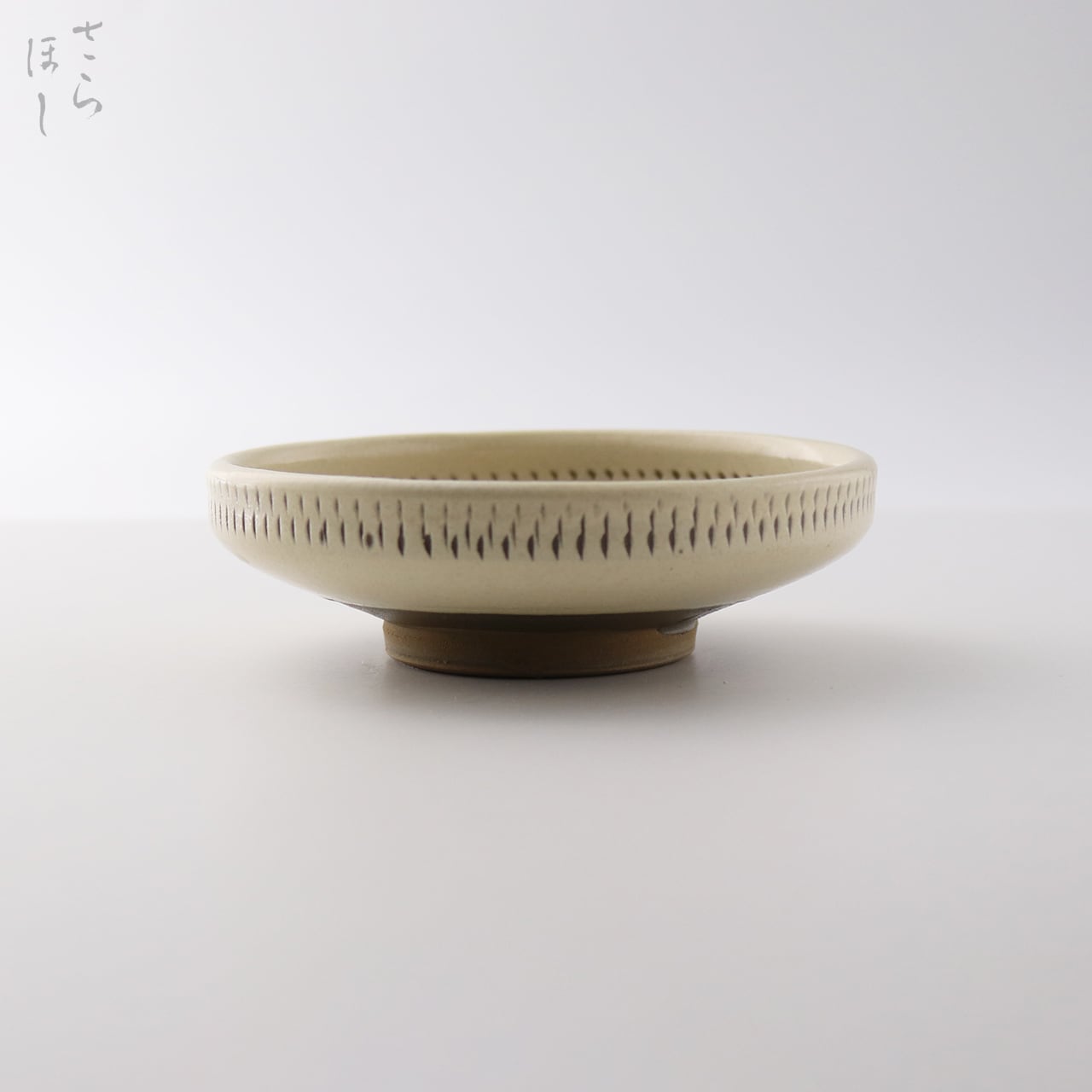 器の内外に小鹿田焼の伝統技法である「飛び鉋(かんな)」を施しています。弾力性のある金属で作った鉋を使用し、細かい連続的な削り目をつけ模様をつける技法です。