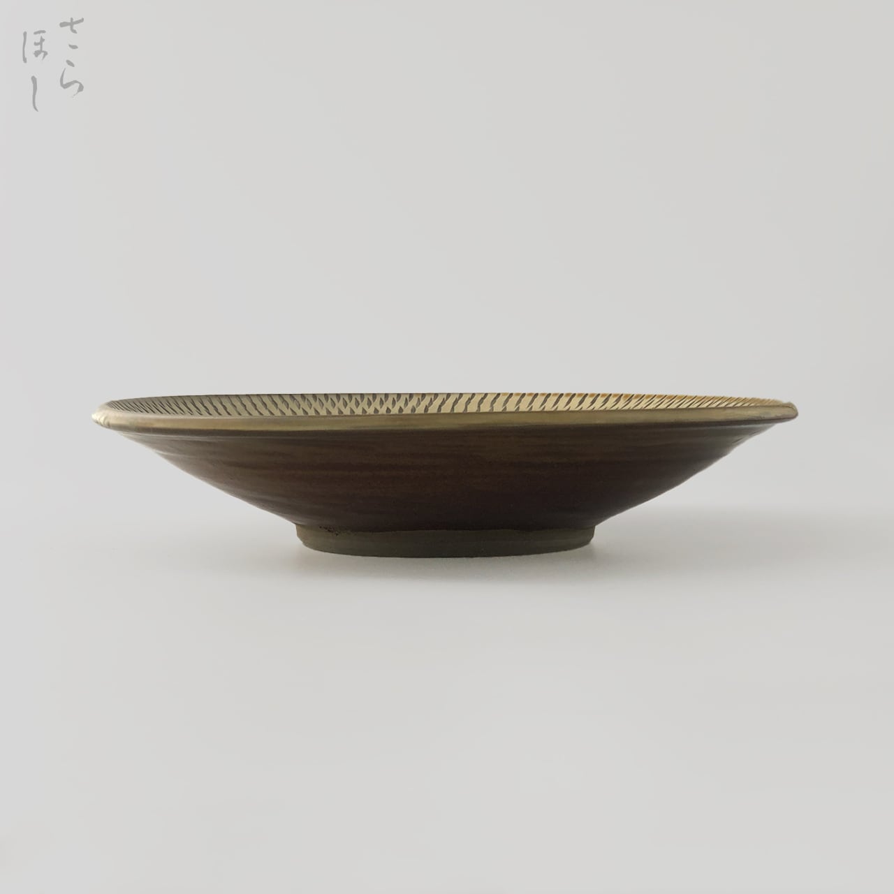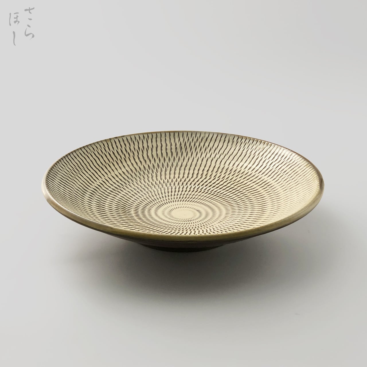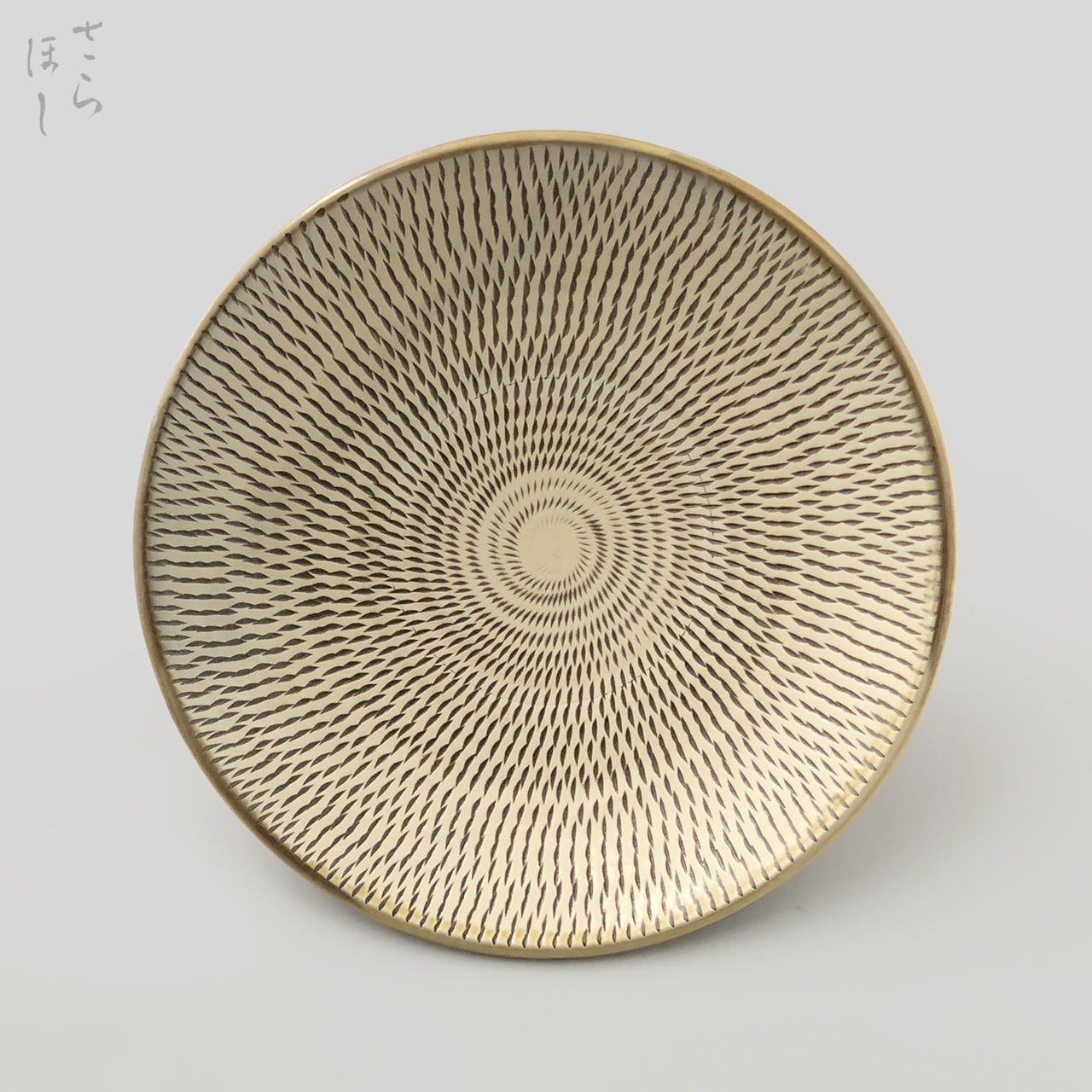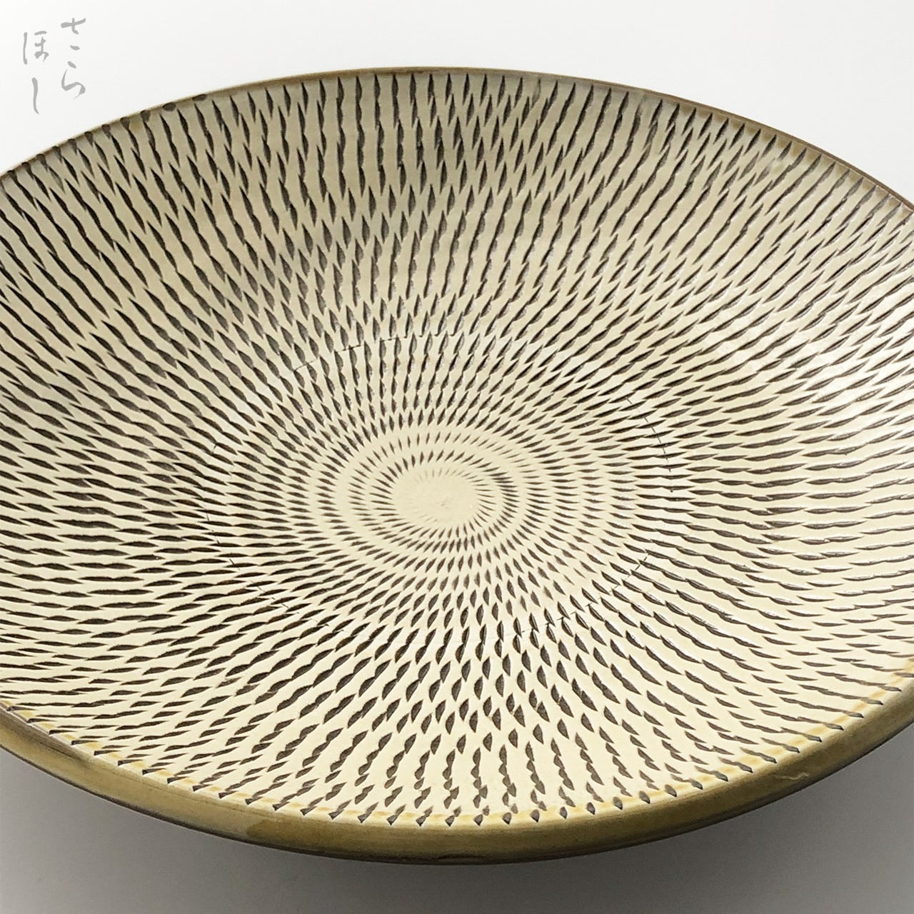 器の内側に小鹿田焼の伝統技法である「飛び鉋(かんな)」を施しています。弾力性のある金属で作った鉋を使用し、細かい連続的な削り目をつけ模様をつける技法です。