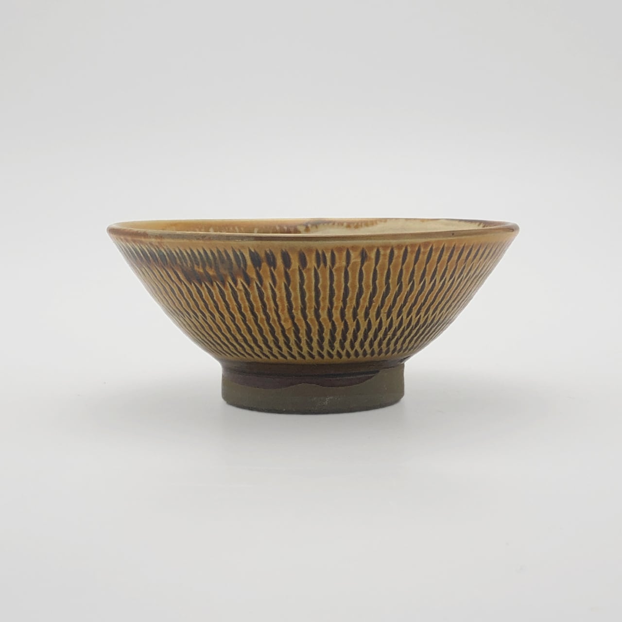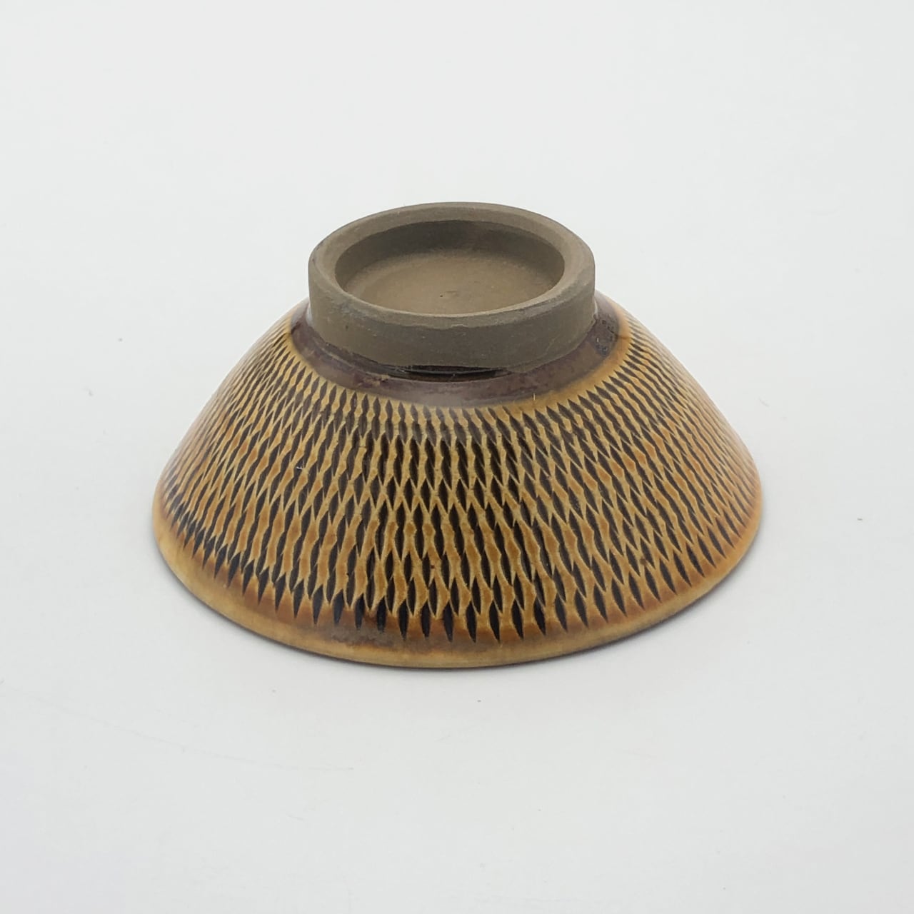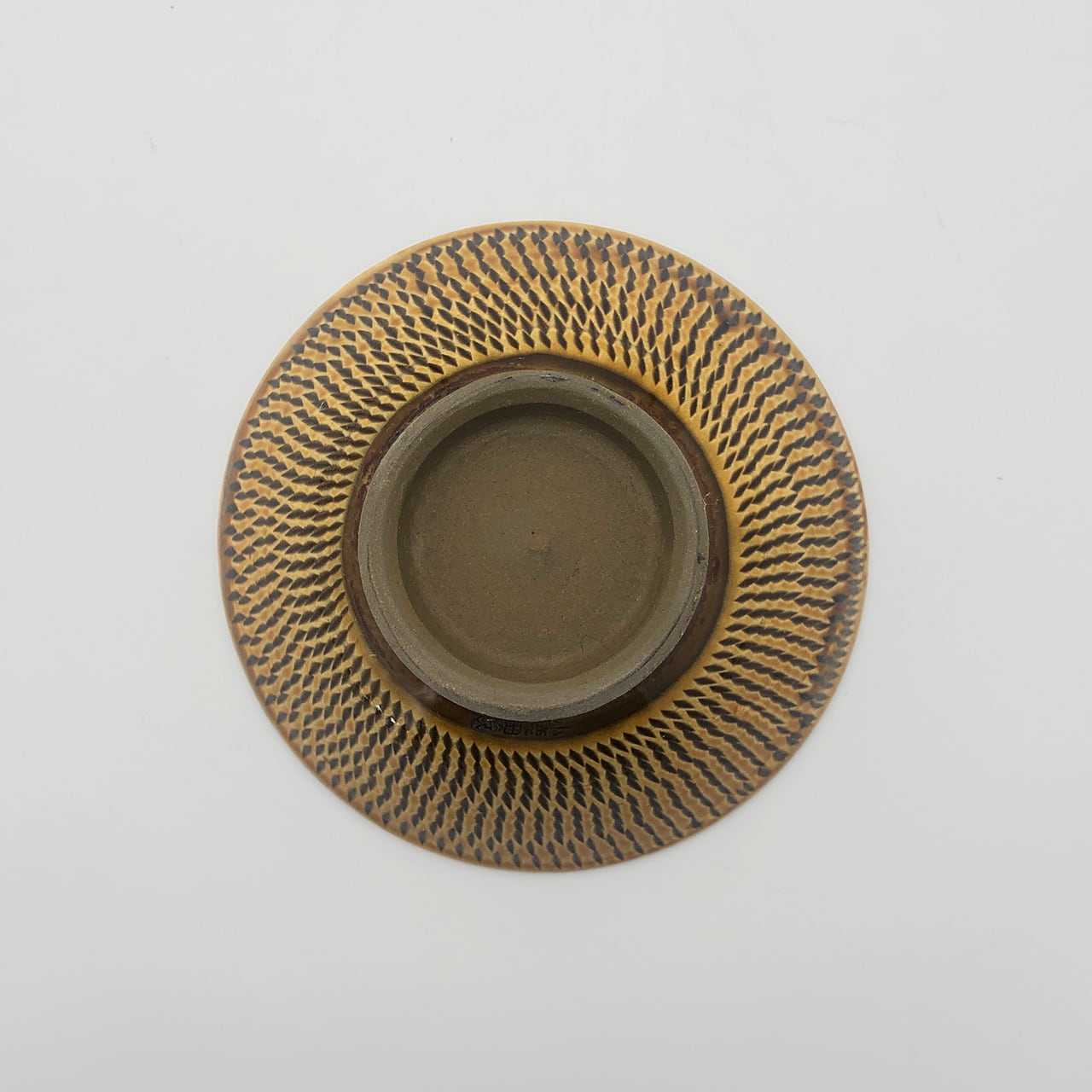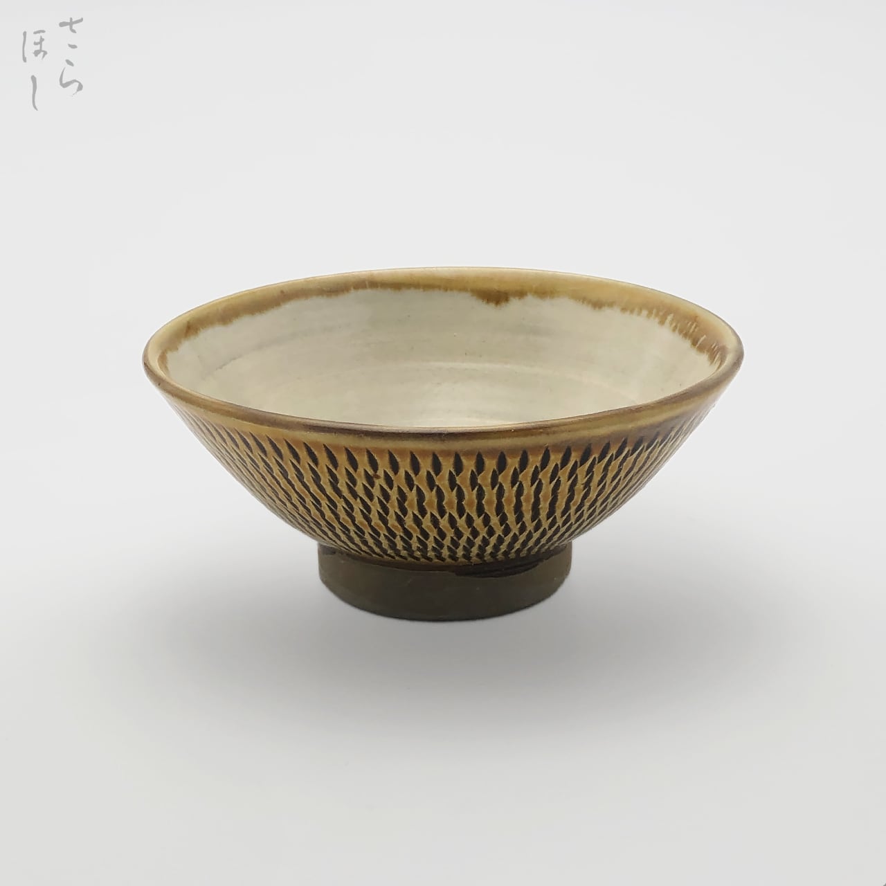 飴釉を施し、器の外側に小鹿田焼の伝統技法である「飛び鉋(かんな)」を施しています。弾力性のある金属で作った鉋を使用し、細かい連続的な削り目をつけ模様をつける技法です。