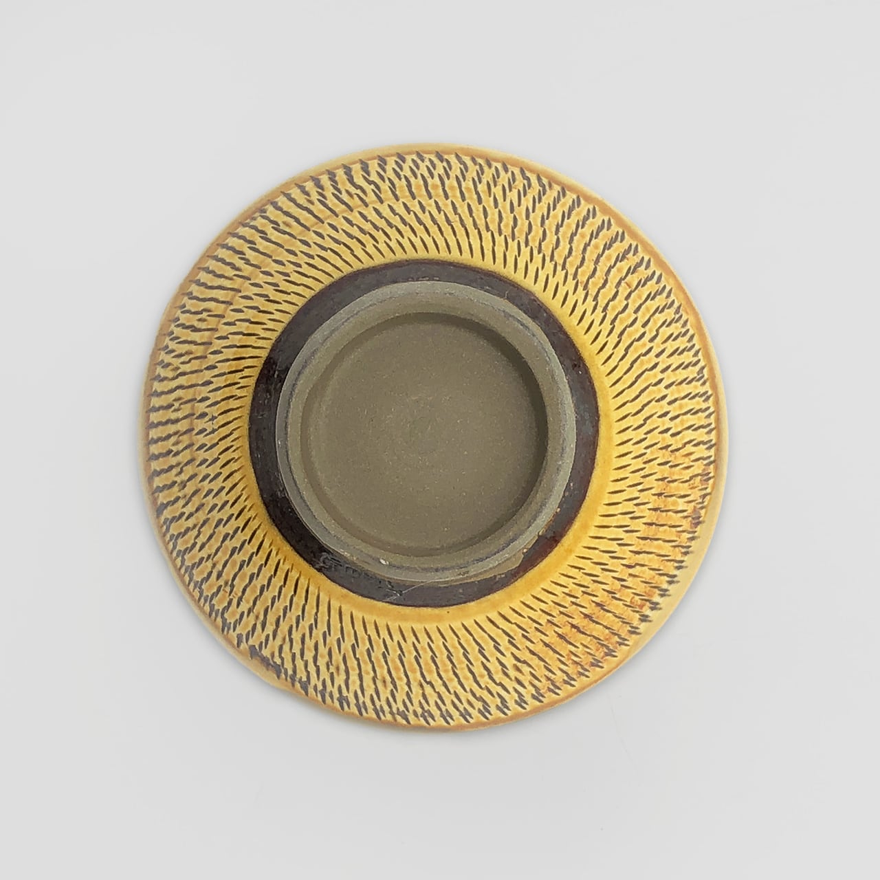 小鹿田焼はお皿等を複数枚重ねて焼きます。その際、重なった部分がくっついてしまわないよう、釉薬を剥がした跡が白い円(目剥ぎ)となって現れます。一番上で焼かれたものは目剥ぎがありません。目剥ぎは、兄弟窯の小石原焼にはなく、小鹿田焼の特徴のひとつでもあります。ご注文の際は目剥ぎの有無をご指定いただけません。ご了承ください。